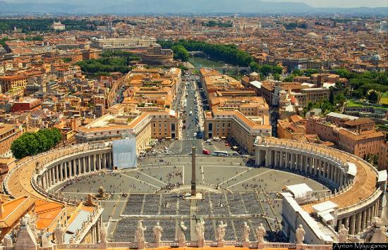 中央のオベリスクが印象的な広場。ヴァチカン市国は公開の区域に限り入場は自由です。営業時間内は大聖堂のクーポラに上ることでき、広場を眺めることができます。(要料金)