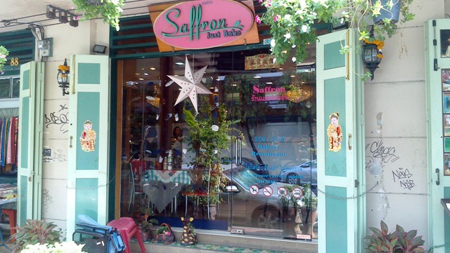 Saffron Just Bakedはカオサンエリア、プラ・アーティット通りにあるとても小さなコーヒーショップです。ボートでカオサンに遊びに来る場合に利用するプラ・アーティットピアを出て右へ100m進んだ場所にあり、隣はマッサージショップ、2軒隣にはセブンイレブンがありますので直ぐに見つかることでしょう。
