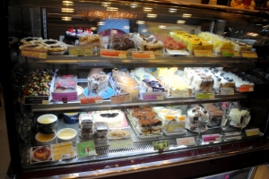 このお店の自慢は全て店内奥のキッチンで作るホームメイドスイーツ。店内のガラスケースに並ぶのはショートケーキやティラミスなどの代表的なケーキ類からアップルパイ、ブルーベリーパイなどのパイ類まで全て手作りの商品で、化学調味料、甘味料の類は一切使っていません。